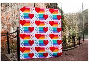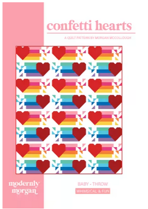 Spread love like confetti! The Confetti Hearts quilt pattern combines hearts and confetti trails in a way that will delight every quilter! Go with traditional rainbow confetti trails...or mix it up with your own favorite colors and prints! Sizes: Baby/Child Throw 42in x 46.5in and Throw 63.5in x 75in.